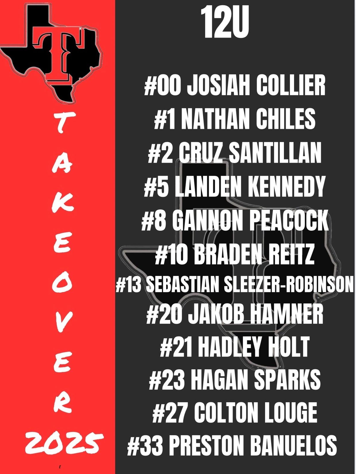 Our 12U Texas Takeover baseball team is prepared to take the 2025 Spring season by storm! These seasoned players bring a mix of experience, talent, and passion to the field, ready to challenge any opponent that comes their way. With their eyes on the prize, this team is set to deliver some unforgettable performances. Let’s rally behind our 12U Texas Takeover as they strive for excellence this season!